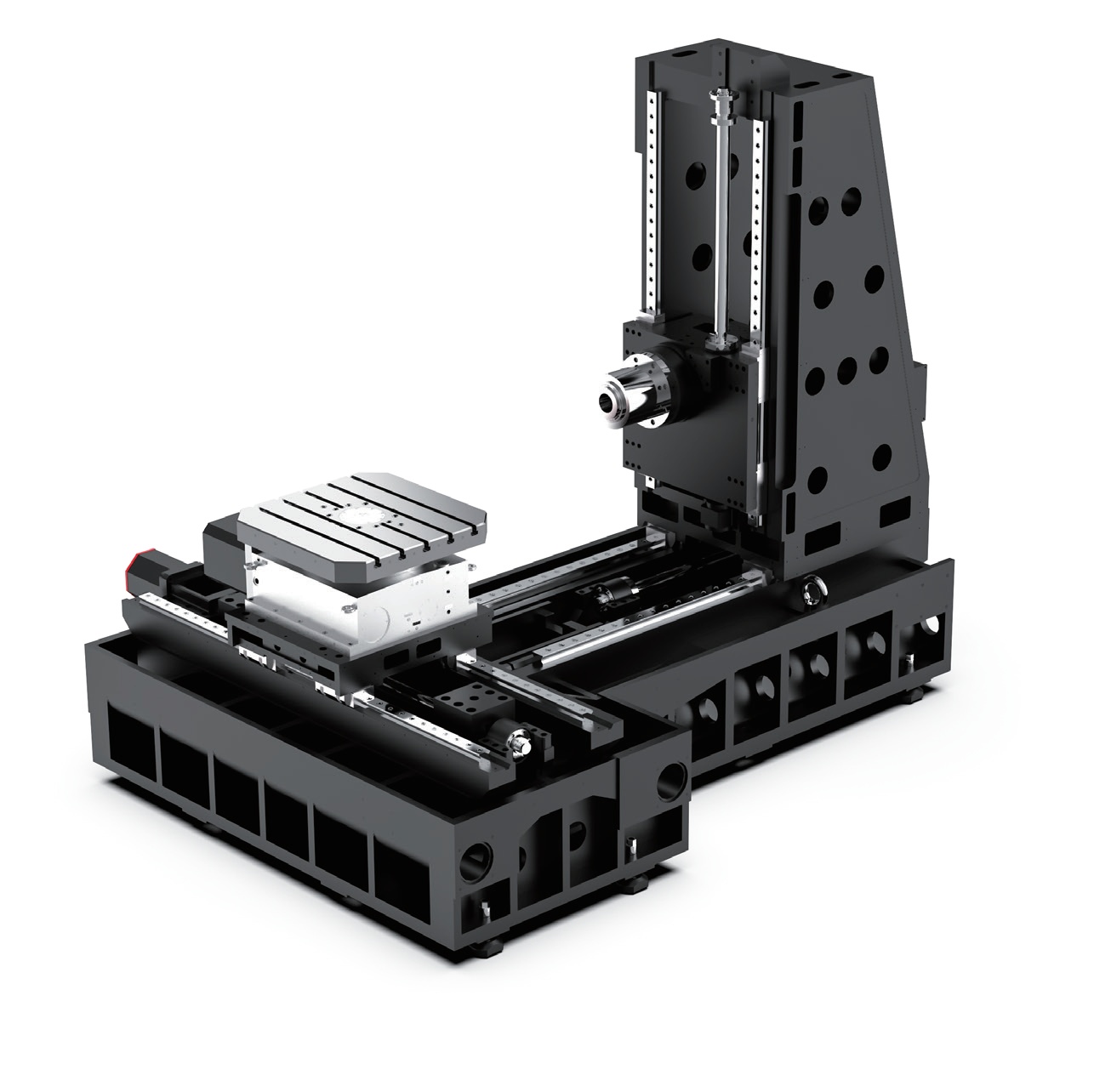 แท่นเครื่องมีรูปทรงตัว T โดยโต๊ะทำงานเคลื่อนที่ในทิศทาง X บนแท่นด้านหน้า และเสาเคลื่อนที่ในทิศทาง Z บนแท่นด้านหลัง กล่องแกนหมุนมีสองแบบ คือแบบแขวนอยู่กับที่และแบบแขวนด้านข้างบนเสา โดยเคลื่อนที่ในทิศทาง Y เหมาะสำหรับการประมวลผลหลายขั้นตอน เช่น การเจาะและการกัดชิ้นส่วนขนาดกลางและขนาดใหญ่ โดยเฉพาะชิ้นส่วนที่มีความยาวมาก